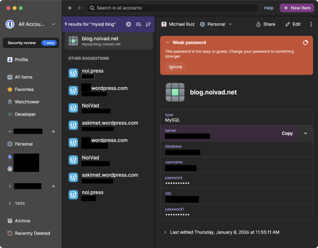 Another feature is that 1Password will only fill out passwords on the site you have it saved to. That means 1password.com will fill and and 1password.it won’t offer to fill. If you get a site you visit but 1Password doesn’t have a password you saved for it then it is probably a fake virus laden site. navigate away from it, and type in the site you were looking for in duckduckgo.com or google, etc. The only downside to this is if you use a weak password for your 1Password account.* I can’t stress this enough: Make you 1P password something long and complex, and allow touchID so you can log in with a fingerprint. I have mine set to require me to enter my password every 30 days. Just make sure you only enter your master password in the app or on the 1password.com site.