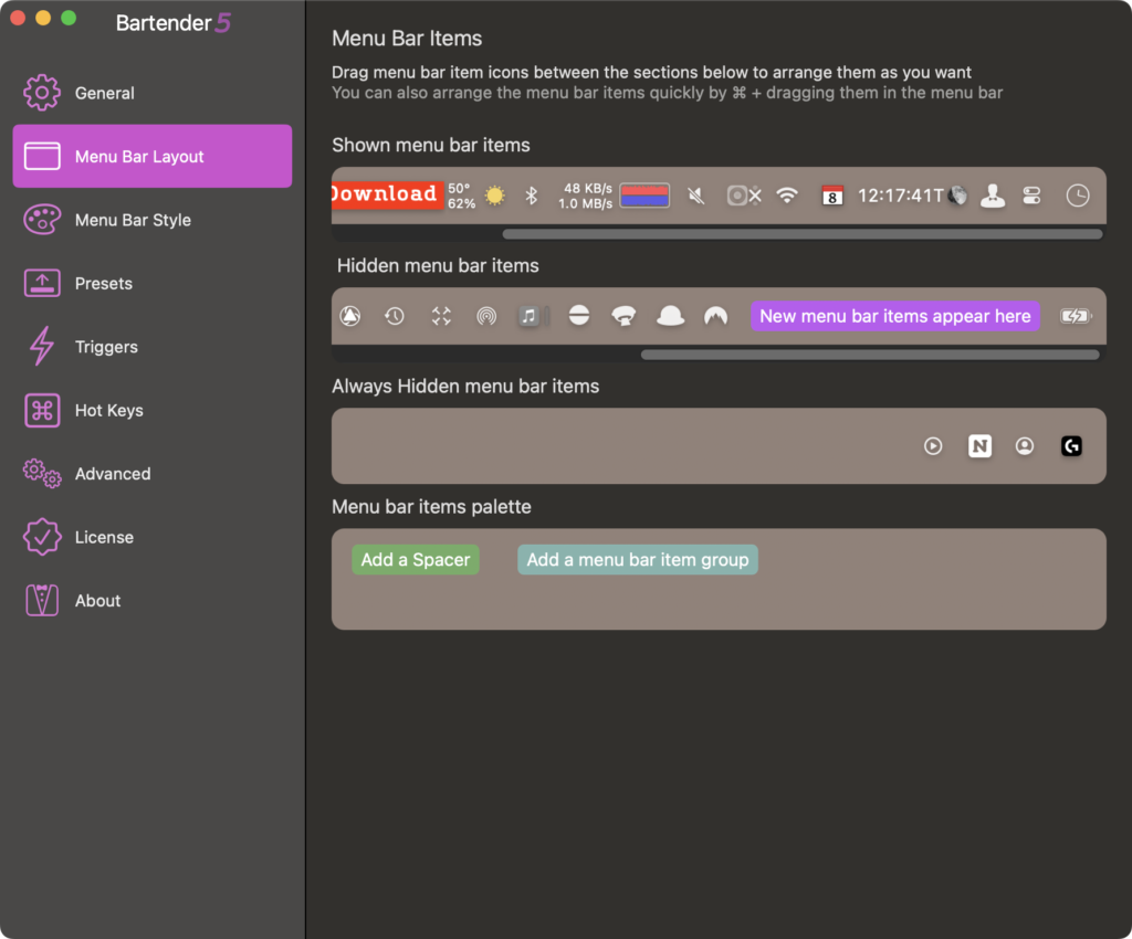 https://www.macbartender.com/ $20 Tidyness, GUI enhancement