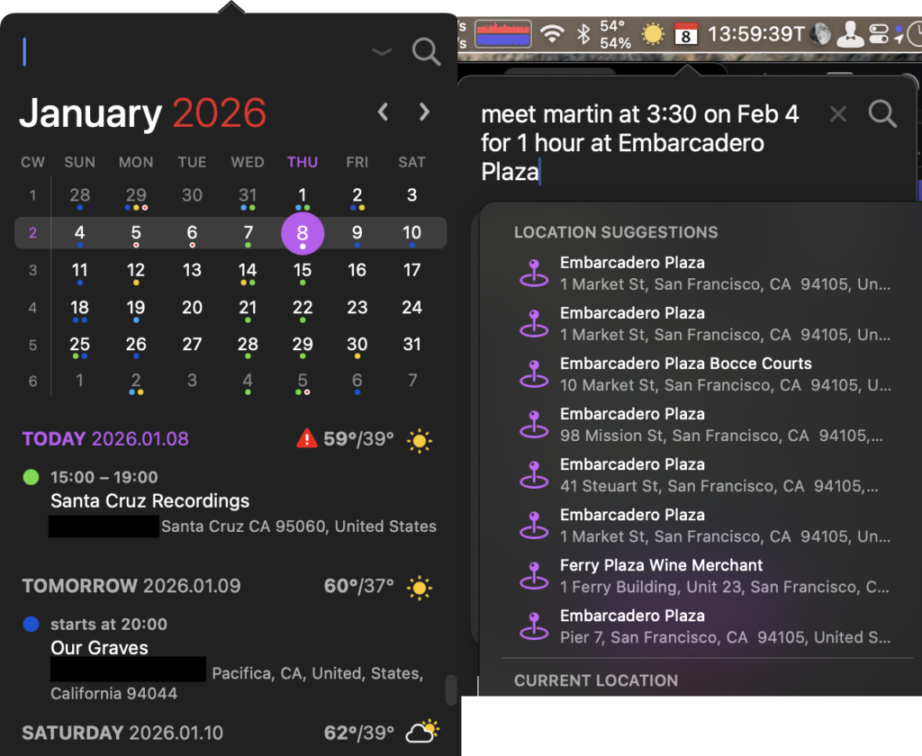 There are a of of calendar management programs in addition to the built in calendar that’s part of macOS, but this one takes the cake because you can use plain text to make appointments/reminders. “Meet Martin at 3:30pm to 5 at Embarcadero Plaza” and Fantastical translates into an appointment with a popover you can select the location, and that allows you to set a “Time To Leave” reminder that is independent of other notifications. On iOS can take text in the clipboard and make that into an appointment. It supports all calendar types: google calendar, CalDav, etc.