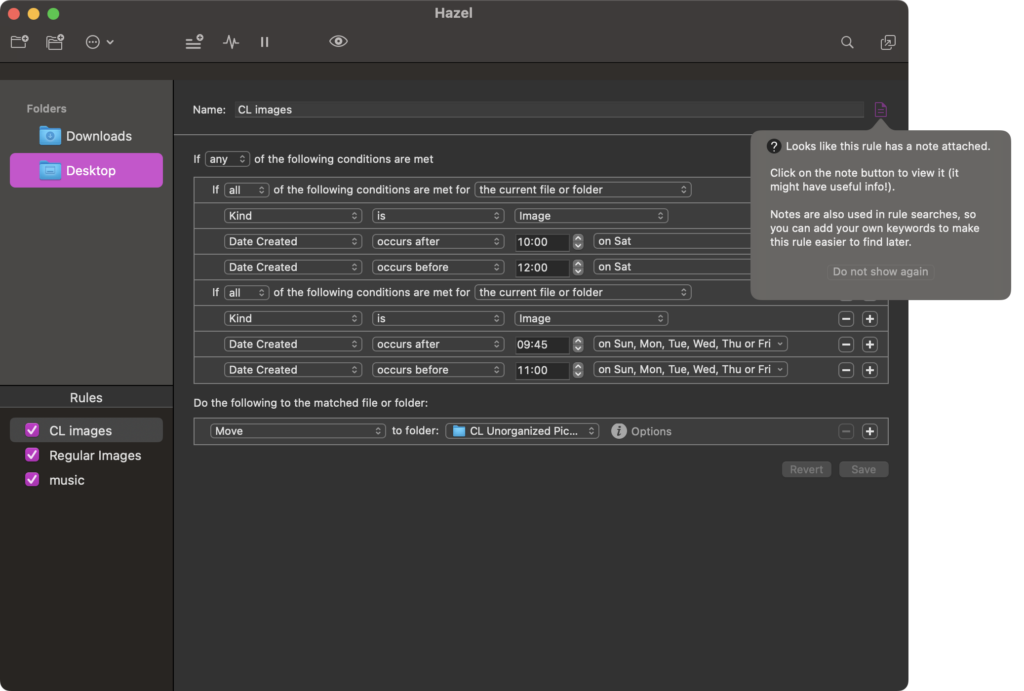 Hazel is a great app that can keep your desktop free of clutter. You simply open in up and configure it. Above you can see my simple configuration for filing screen shots taken between the hours of 9:45 and noon Sunday through Friday should be put in a different folder. It will automatically put images that would normally end up on the desktop in a folder I made called CL Unorganized Picture. You can do that to, just name it something more creative than me. 😉 What’s even better is that when you uninstall an app (trashing it), Hazel offers to remove that apps config and working files in your /Library/ and /Users/<username>/Library/ folders (“folder” meaning “directory,” but we’ll use Mac naming conventions.) So, if you install somehinng early on that you find that you later don’t want, Hazel can make it so it was as if that app was never installed on your system. These 2 features make this app worth the $42 it currently is.