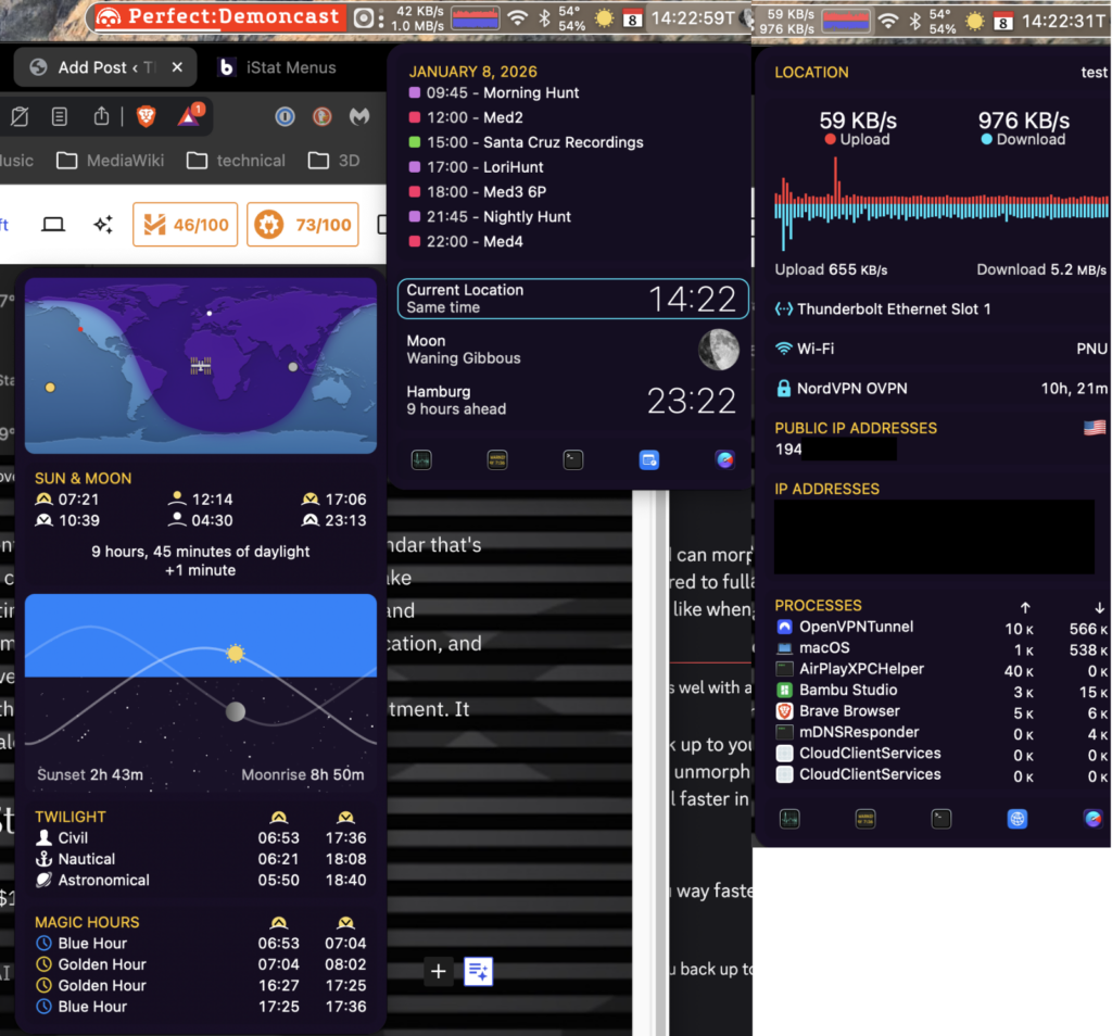 There are other menubar information apps out there (some free), but iStat Menus takes the cake and the kitchen aid mixer that made it in terms of information it can display and customizability. you can show various info about your system: CPU, Memory, Disks, Network, Fans & Temperatures, Power, and Time. And this info is in depth: It can show you how hot your CPU, Battery, WiFi Palm Rest, SSD, and more is running. Each section of the app shows more information than you’ll probably need. Need your IP address? It’s under the network menu. You’re in California and need to know what time is it in German to make sure your friend isn’t sleeping? The Time menu’s got you. I always show my CPU and Network graphs because you can tell in an instant if your network is down or you can tell whether your CPU functioning as normal or if it is churning through something that takes time to process. Time and weather* are bonuses. Sure there’s weather apps out there, but none fit snuggly in your menu bar with a pulldown menu to see things in detail with a single click.